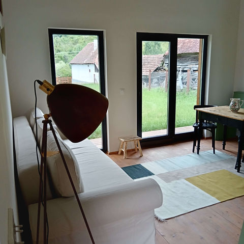 Wild Flower tiny-house hosts two individual cabin units, with panoramic windows, have great views over the surrounding meadows.
